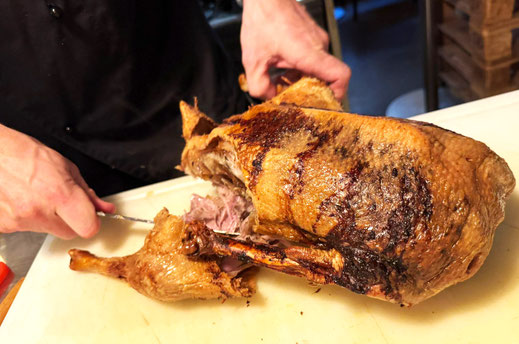 Endlich ist sie da - die heilige Saison der feierlichen Maßlosigkeit! Auch dieses Jahr dürfen wir für euch wieder die sensationellen Weidegänse der Familie Radelsböck vom Meierhof im Mostviertel knusprig braten - ganz klassisch serviert mit Knödel, Rotkraut und Maronisauce. Und als ultimative Vorspeisen gibt's natürlich wieder die hausgemachte Gänseleberpastete - natürlich keine Stopfleber! - und die Ganslsuppe mit ordentlich viel Majoran. Wichtig: Wer sich eine Portion Glück sichern will, reserviert am besten einen Tag vorher.